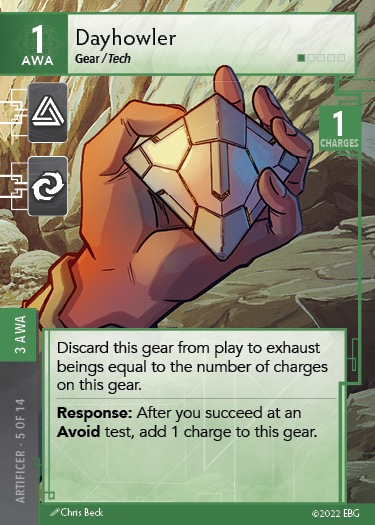 I would not recommend being a 3 SPI or 3 AWA Artificer because Dayhowler and Thoroughly Prepared are a little underwhelming and situational for a high stat requirement card. You’ll get much more use out of the Trekking Poles or Darter and they effect the game state in much more powerful ways.