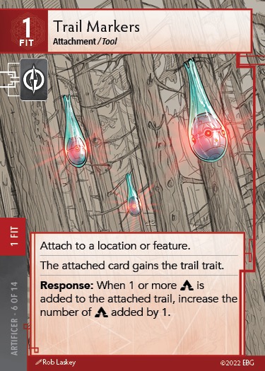 And as in the artifice, you’ve got these two nice attachments, trail markers, carbon forge cable. So you’re, you’re able to use those again moment of desperation gives you another way to use this gear that might have a bunch of tokens on it. You can deal some harm to a being that way. And then favorite gear is a really nice way to soothe fatigue.