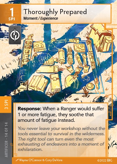 This is the turn-to-turn fatigue-avoidance version of Thoroughly Prepared. You can avoid fatigue from tests, Ambush, or challenge effects on path cards. Since it does not exhaust you can use it as many times as you have charges on it. Fantastic. That will really add up over the course of the day if you can keep it sustained as the Tinkerer. And it only costs 1 gear slot!