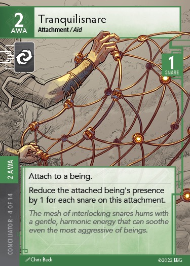 Tranquility Snare is a decent card decent card. You can permanently reduce the presence of a being. This can be really helpful for a big predator or one of the mega-predators on the lure mission. Reducing presence lets you Avoid or Connect more easily, interact beyond without taking fatigue, and some other tests key off Presence. As well, if the predator does damage based on its presence that is reduced as well.