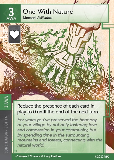 One with Nature is a good, not great, card that seems more powerful than it actually is. It hinges on the word “turn”. A turn is playing a card or performing a test. So one turn is playing One with Nature and just for the next test or card you play, everything has presence 0. It’s helpful if you are facing a cluttered board and need to accomplish one last thing without incurring fatigue. Outside of that hail mary sort of situation it doesn’t help you quite as much.