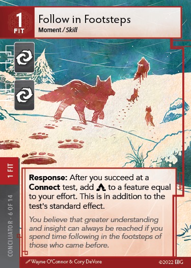 Follow in Footsteps is a great utility card. It supports a 1 FIT build by allowing you to double up the effect of your Connect tests. As a Conciliator you will be Connecting often, at least to Pokodo, and you can make those tests go further with this card.