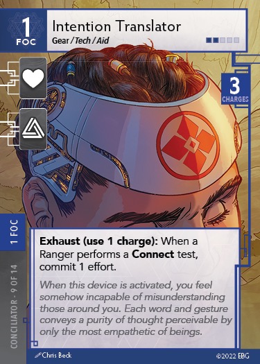 Intention Translator is about the only useful card for a solo Conciliator. It’s an Aid card, so you can get repeated uses out of it and it boosts Connect, which is a test you’ll be performing quite a bit. It isn’t bad in that respect.
