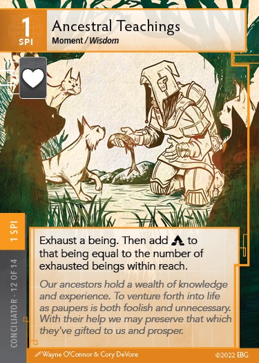 Ancestral Teachings is another also useful 1-cost card. It’s a non-test, non-presence threshold Avoid effect. And it’s cheap. It might be worth inclusion just for this but then you also get to place progress on the Being you just exhausted. If you play with Pokodo and other Companions, or have other exhausted Beings Within Reach, you can add a good chunk of progress with this card.