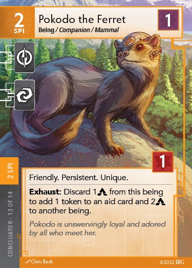 Pokodo the Ferret it is a great card and essential for any Conciliator. First you Connect to Pokodo, who then magnifies that progress to other beings and replenishes/builds up your Aid cards. Early in the day you could connect a couple of times to Pokodo then use that progress for several rounds, meanwhile using your SPI energy for additional tests or card plays.