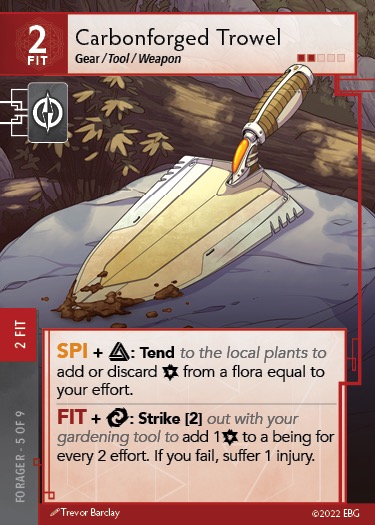 Carbonforged Trowel is the weapon of the background, but a unique one at that. It is the only weapon that allows you to place harm on both features and beings. Additionally, it’s one of the only cards that allows you to heal another card in the game (through its SPI test).