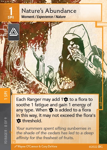 A relevant note for Forager is that you can place harm on cards without a harm threshold but those cards will never clear. This can actually work in your favor if you have a Flora feature that clears through a Ranger token because you have an inexhaustible fuel source for your Flora engine!