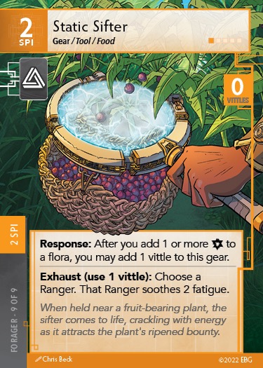 Of the 2 requirement cards, I would rank the Trowel and the Tea Kit as the most important for the Forager Flora engine. Puffercrawler Spores expands your Flora engine to Beings, but it isn’t essential, and there are other ways to soothe fatigue than use Static Sifter. If you take 2 FIT to take the Trowel, you should take 2+ SPI as well to maximize your ability to add or remove harm from flora.