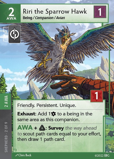 Beyond Companions, the Shepherd maintains a focus on beings, either moving them, exhausting them, or manipulating progress on them. There are no Weapons, little gear, and one of the only healing cards in the game.