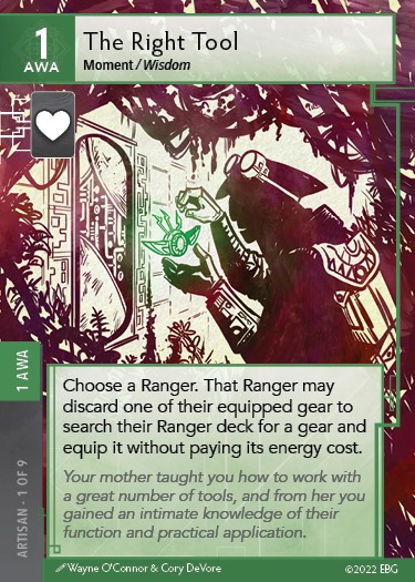 The Right Tool trades out a gear that you can’t or no longer want to use. As such, you get more efficiency out of your gear cards in your deck because it’s less likely that you will be sitting around with the gear with no charges on them. As well, as the name suggests, if you’re facing a tricky situation this card helps you go find the gear you need to solve it. On top of it all, avoiding paying the energy cost to equip is also potentially valuable energy efficiency.