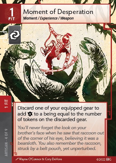 Moment of Desperation makes any gear into a weapon and you could do a ton of damage if you have a way to build up tokens on that card, either through a Response on it or if you are using the Exceptional Tinkerer or Voice of the Elders role. The best implementation of this card is to just have one in your deck because it’s unlikely that you’ll need to do a big bunch of damage more than once in the course of one day. You do have to discard the gear so overly relying on this card results in chucking otherwise useful gear away. So think of this as the oh shit, big boss, backup plan card, as the name suggests.