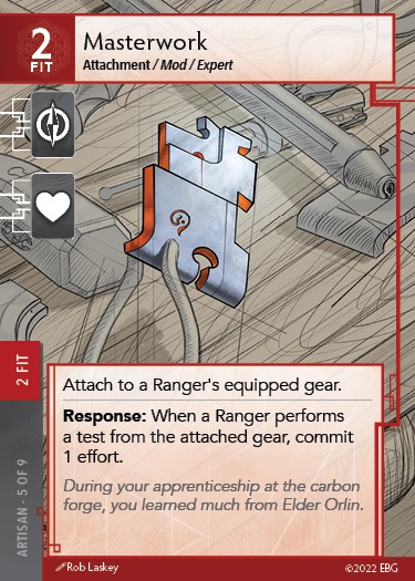 Fitness and Awareness are the two best spheres so to get the most out of choosing Artisan you will want your Aspect to give you 2 energy in each of those spheres. The 2-requirement cards in Focus and Spirit are underwhelming and you won’t miss them if either of those is your dump stat. You can be clever and plan to use Masterwork to compensate for one of these being your low stat if you attach it to a gear card with a test in that energy, but that is a fringe combo and probably not worth building a deck around.