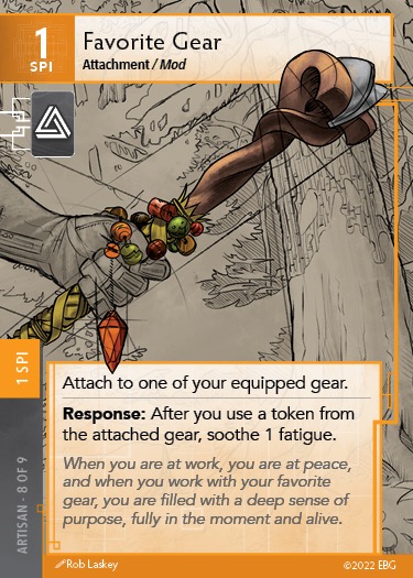 Looking a little deeper, the test on many of these gear cards uses the same energy as the sphere of the cards. In other words, a fitness card has a fitness test. This is worth pointing out because the extra effort is less useful if your Aspect gives you more of that energy to begin with. Of the three cards I mentioned with scaling effects, three of them (Meditation Pillow, trowel, and Darter) have cross-energy tests. Meditation Pillow is a SPI card but uses a FOC test, the Trowel has both FIT and SPI tests and Darter is a FIT card with a FOC test. The potential pairing of Masterwork with these cards could let you boost up a lower FOC or SPI Aspect to be more useful.