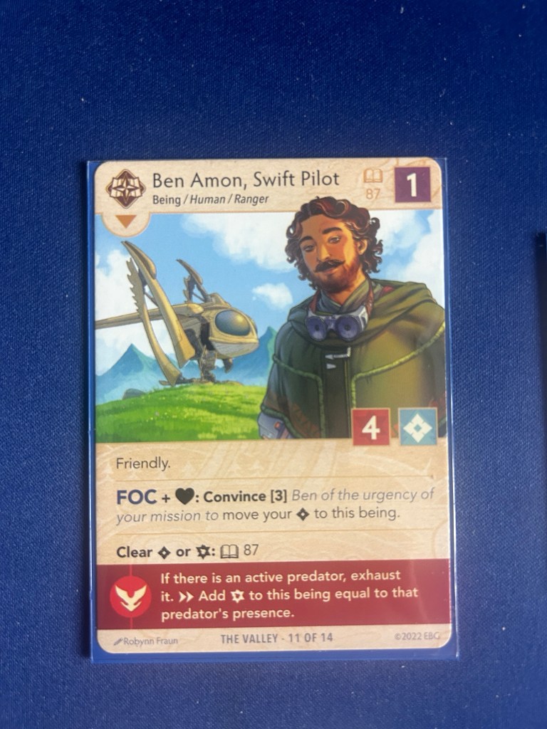 I make quick work of the first travel today and land at the Mound of the Navigator and deal with my first non-Mountain terrain set since Lone Tree Station. Old Growth is no joke though. My Ranger doesn’t have much hope among the Bears, Bees, and rotting logs until Ben Amon flies out of Path deck. I don’t bother to ask him what he’s doing out in the Swift in the Howling Winds and charter a trip to the Sunken Outpost. Bye bye Bears! I also get to skip over a Swamp location to boot. Ben to the rescue!